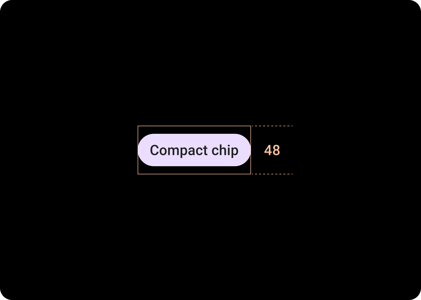 צ'יפים קומפקטיים כוללים חריץ לסמל וחריץ לתווית טקסט של שורה אחת. לצ'יפים קומפקטיים יש אזור שניתן להקיש עליו בגובה 48dp.