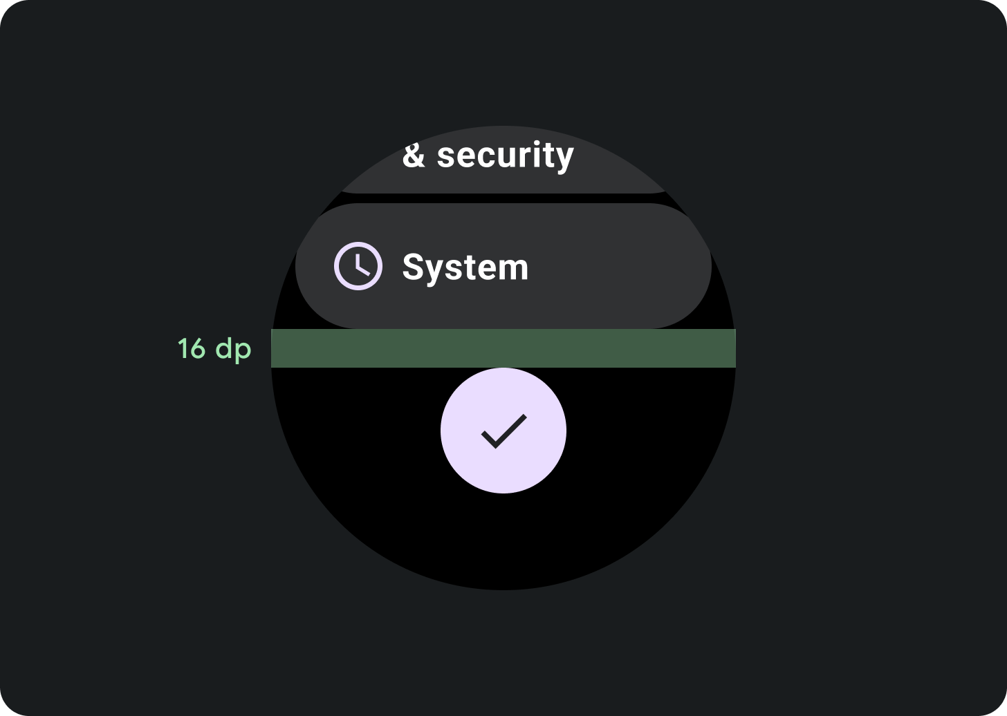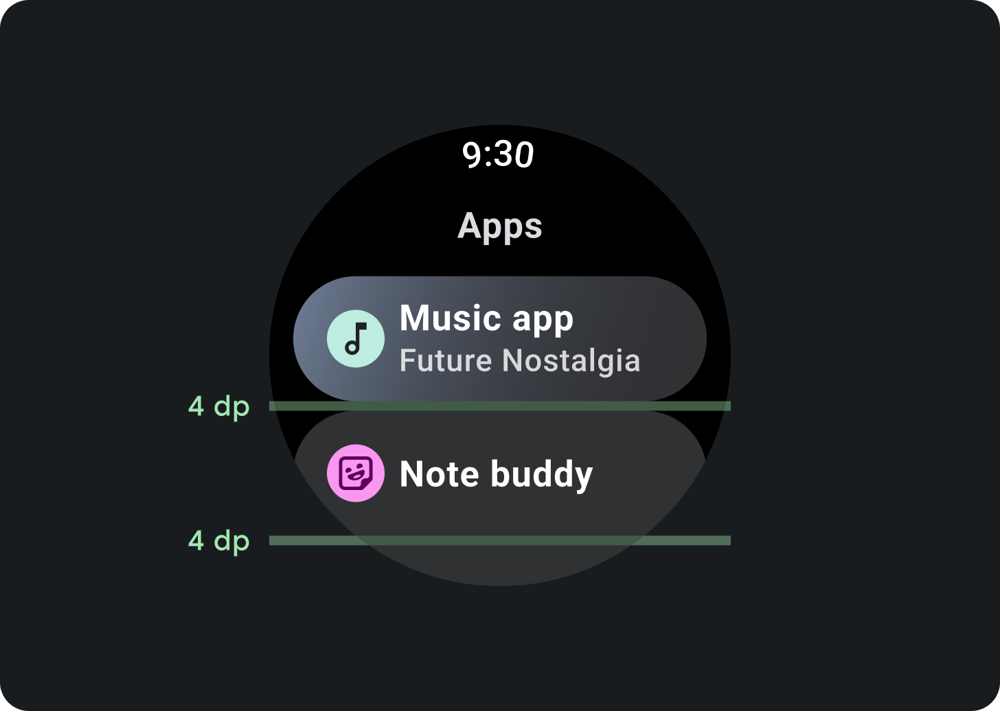 標準化されたパディングは、要素に応じてリストを作成するときに使用されます。より複雑なリストでさらに垂直方向のパディングが必要な場合は、一貫性を保つためにスペースを 4 dp の倍数で設定します。