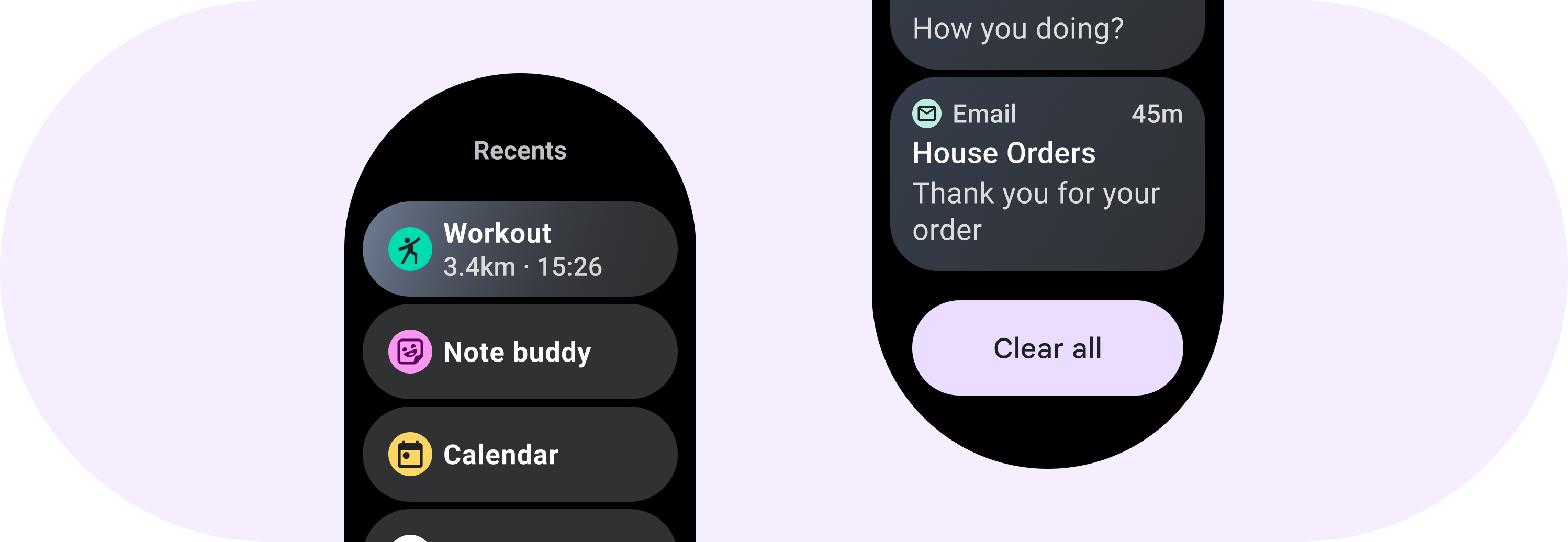 ScalingLazyColumn は、Wear OS 専用に作成された LazyColumn のカスタマイズです。リストを使用すると拡大縮小や透明化が可能で、画面の上部と下部でコンテンツを縮小またはフェードして、ユーザーが注目すべき点を把握しやすくなります。リストは画面の中央に固定されるため、リストの中央にあるアイテムがさらに強調されます。