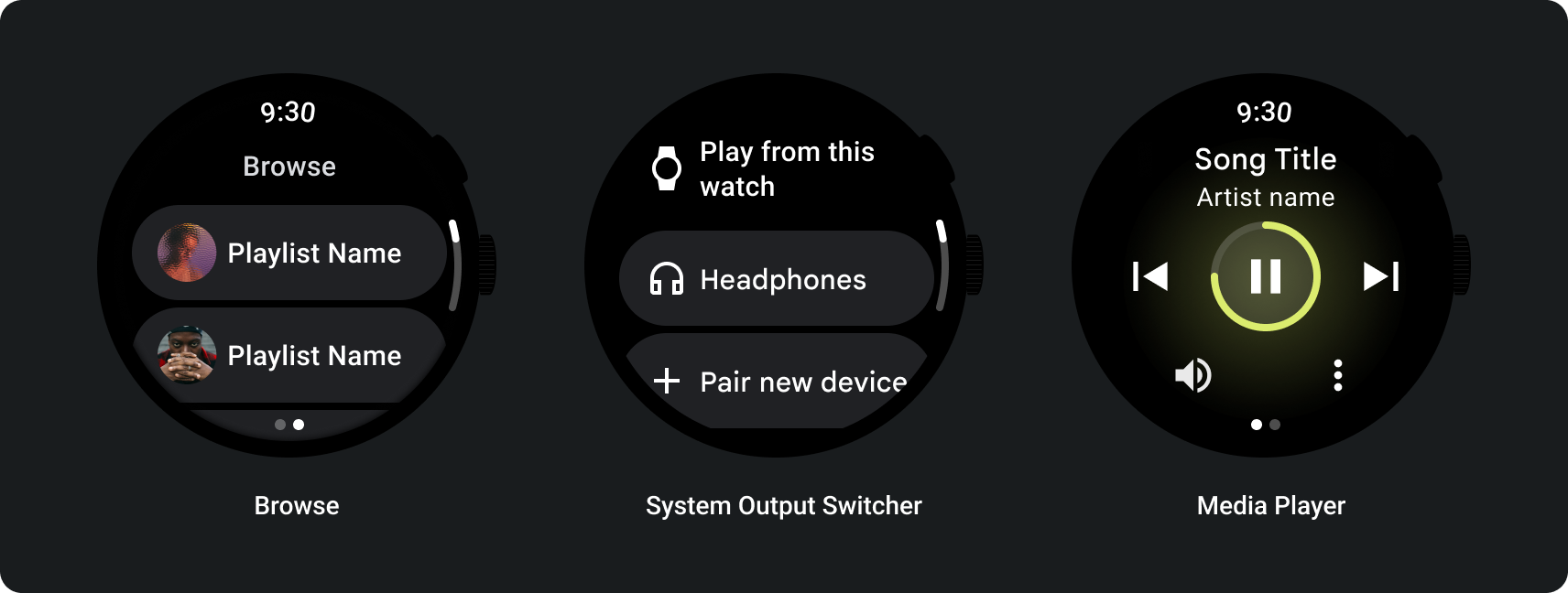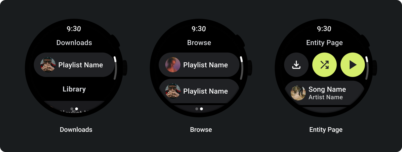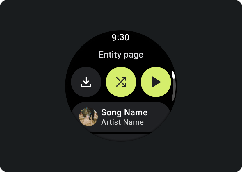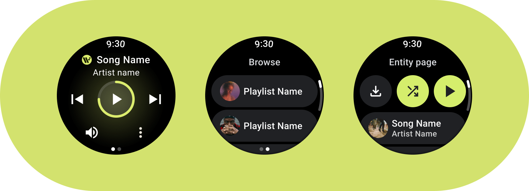 Wear OS के डिज़ाइन से जुड़ी ज़रूरी शर्तों को पूरा करने वाले मीडिया ऐप्लिकेशन बनाएं. मीडिया ऐप्लिकेशन में अक्सर ब्राउज़ करें और इकाई पेज शामिल होते हैं.