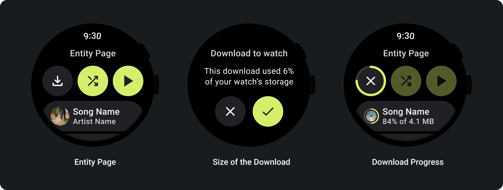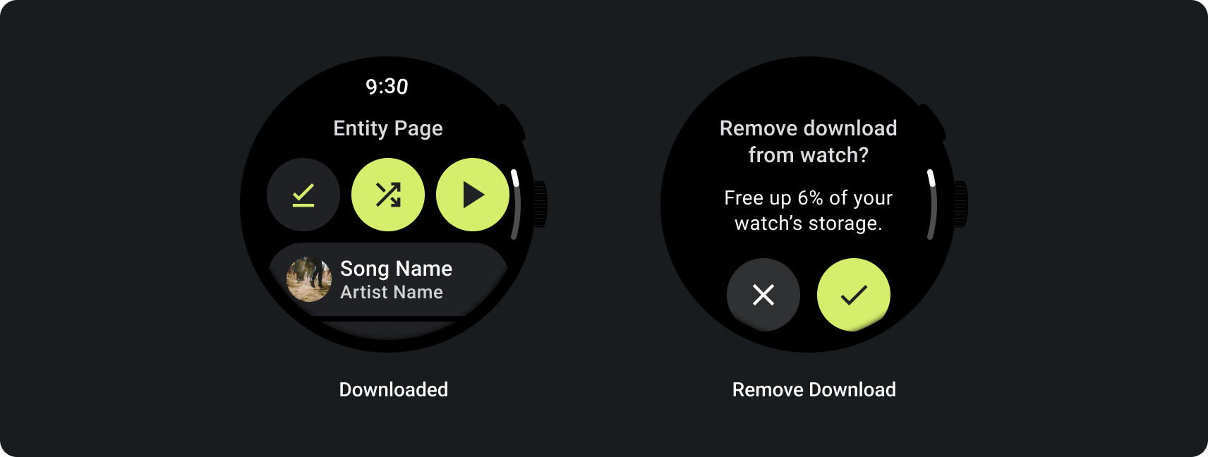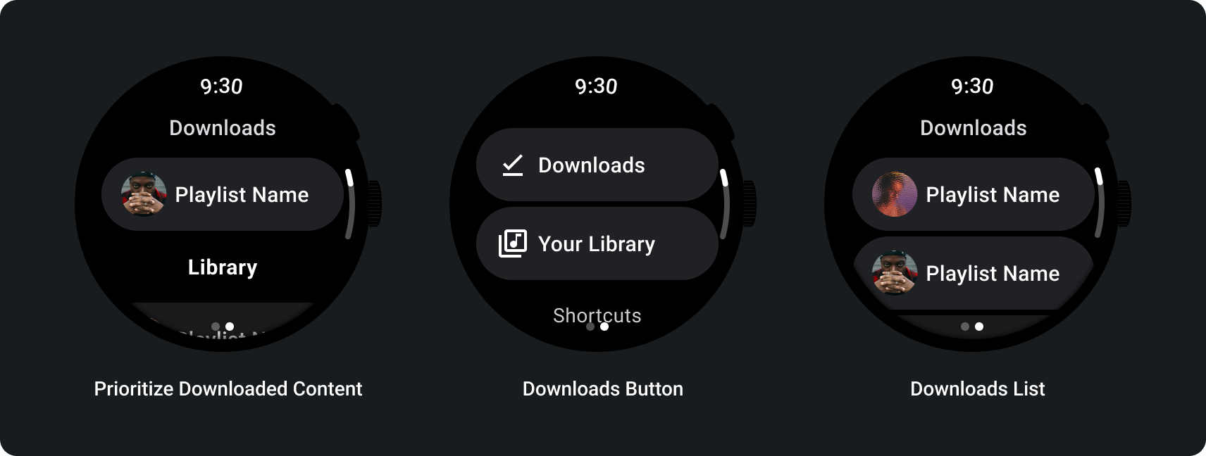स्मार्टवॉच से मीडिया स्ट्रीम करने से, Wear OS डिवाइस की बैटरी पर काफ़ी असर पड़ता है. जब उपयोगकर्ता अपने Wear OS डिवाइस पर संगीत सुनना चाहें, तो डाउनलोड किए गए कॉन्टेंट को प्राथमिकता दें. इसके लिए, ब्राउज़ करने की सूची में हाल ही में डाउनलोड किए गए कॉन्टेंट को दिखाएं. एक बटन जोड़ें, जो उपयोगकर्ताओं को डाउनलोड की पूरी सूची पर ले जाए. जैसा कि इन इमेज में दिखाया गया है: