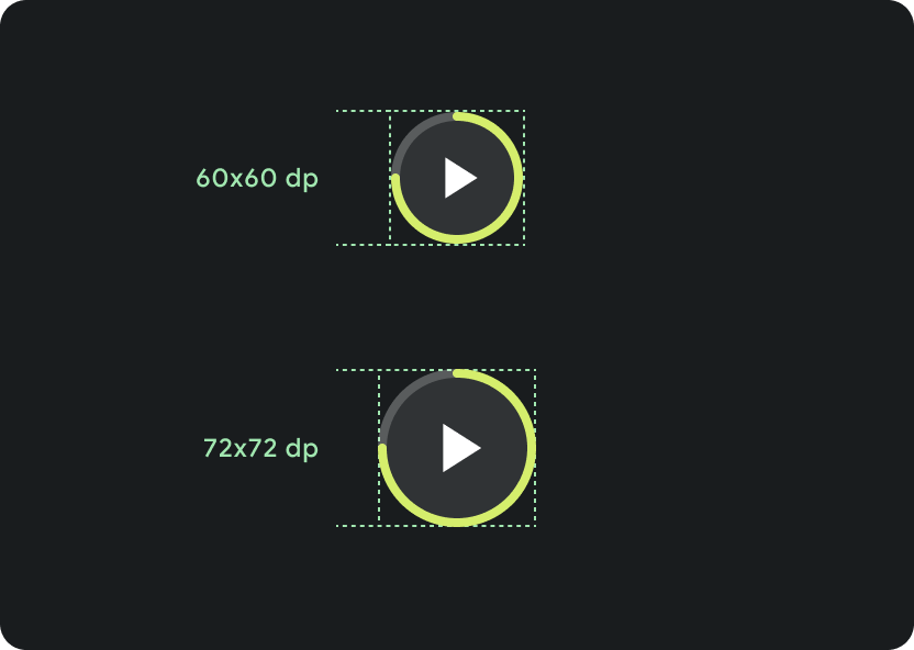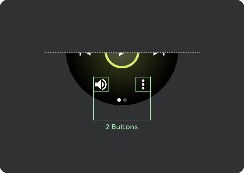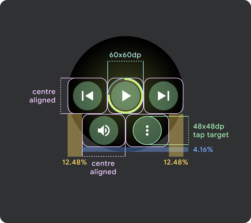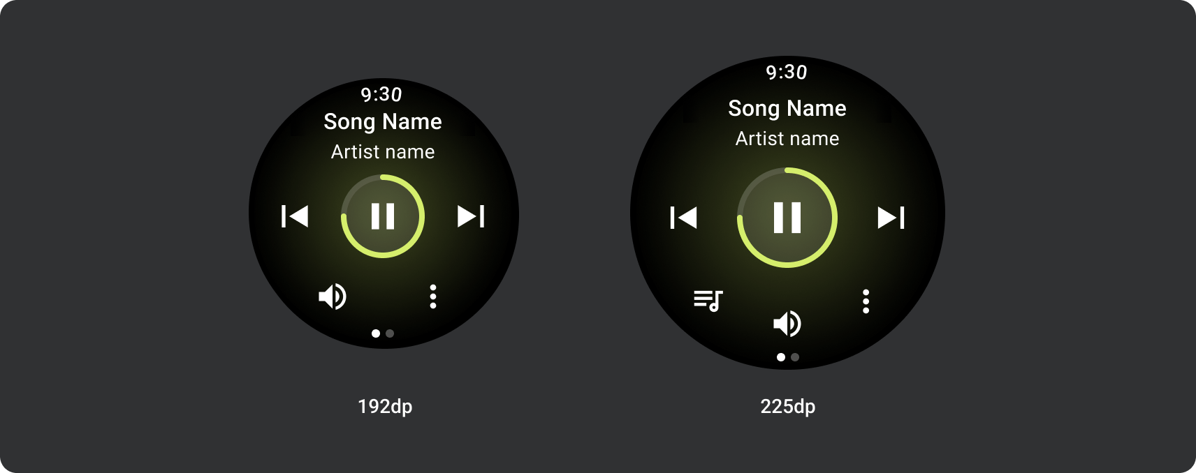 Wear OS डिवाइसों पर, मुख्य कंट्रोल (चलाएं/रोकें) का साइज़ 60 dp से 72 dp तक होता है. यह साइज़, 225 dp से ज़्यादा डिसप्ले वाले डिवाइसों पर दिखता है. इससे बीच का सेक्शन 72 dp ऊंचा हो जाता है. इसलिए, इसमें मौजूद सभी कंट्रोल के लिए टैप टारगेट बढ़ जाते हैं. यह रिस्पॉन्सिव व्यवहार में बनाया गया है, जो आपको मीडिया प्लेयर टेंप्लेट से मिलेगा.