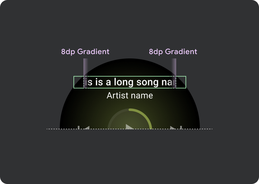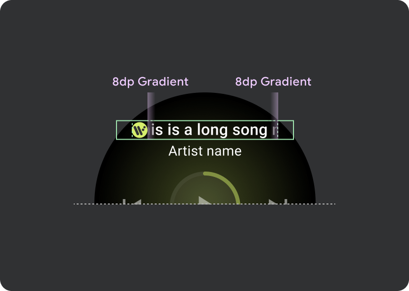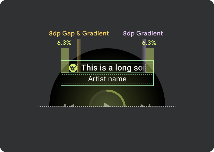 हेडर में, 9.38% के यूनिवर्सल मार्जिन का इस्तेमाल करें. साथ ही, गाने के टाइटल के लिए 6.3% का अतिरिक्त मार्जिन भी इस्तेमाल करें. स्क्रोल किए जा सकने वाले टाइटल के लिए 8dp ग्रेडिएंट का इस्तेमाल करें. साथ ही, अगर कोई आइकॉन मौजूद है, तो 8dp ग्रेडिएंट के साथ 8dp का अतिरिक्त गैप दें. आइकॉन के नीचे, मार्की स्क्रोलिंग ट्रांज़िशन शामिल करें, जिसकी पोज़िशन में कोई बदलाव न हो.
