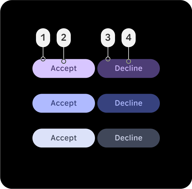 在本例中,按鈕 (2) on-primary 在 (1) primary 上,或 (4) on-primary-container 在 (3) primary-container 上,在對比度等級變更時仍可清楚辨識,且具有 7:1 以上對比度比率的 AAA 評等。