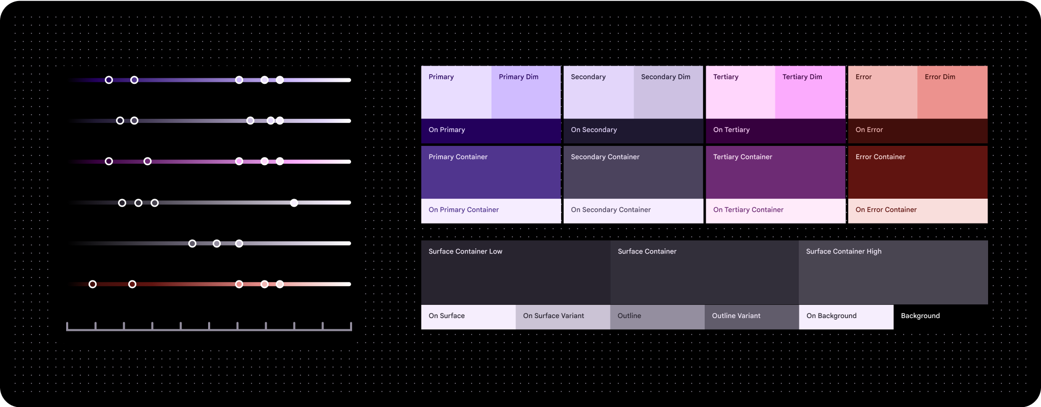 - ระบบจะกำหนดบทบาทของสีให้กับองค์ประกอบ UI ที่เฉพาะเจาะจง เช่นเดียวกับ "ตัวเลข" บนผืนผ้าใบภาพระบายสีตามตัวเลข โดยจะมีชื่อ เช่น หลัก ในหลัก และคอนเทนเนอร์หลัก ใช้บทบาทสีเดียวกันสำหรับทั้งธีมสว่างและธีมมืด ดูบทบาทที่มีสีทั้งหมด