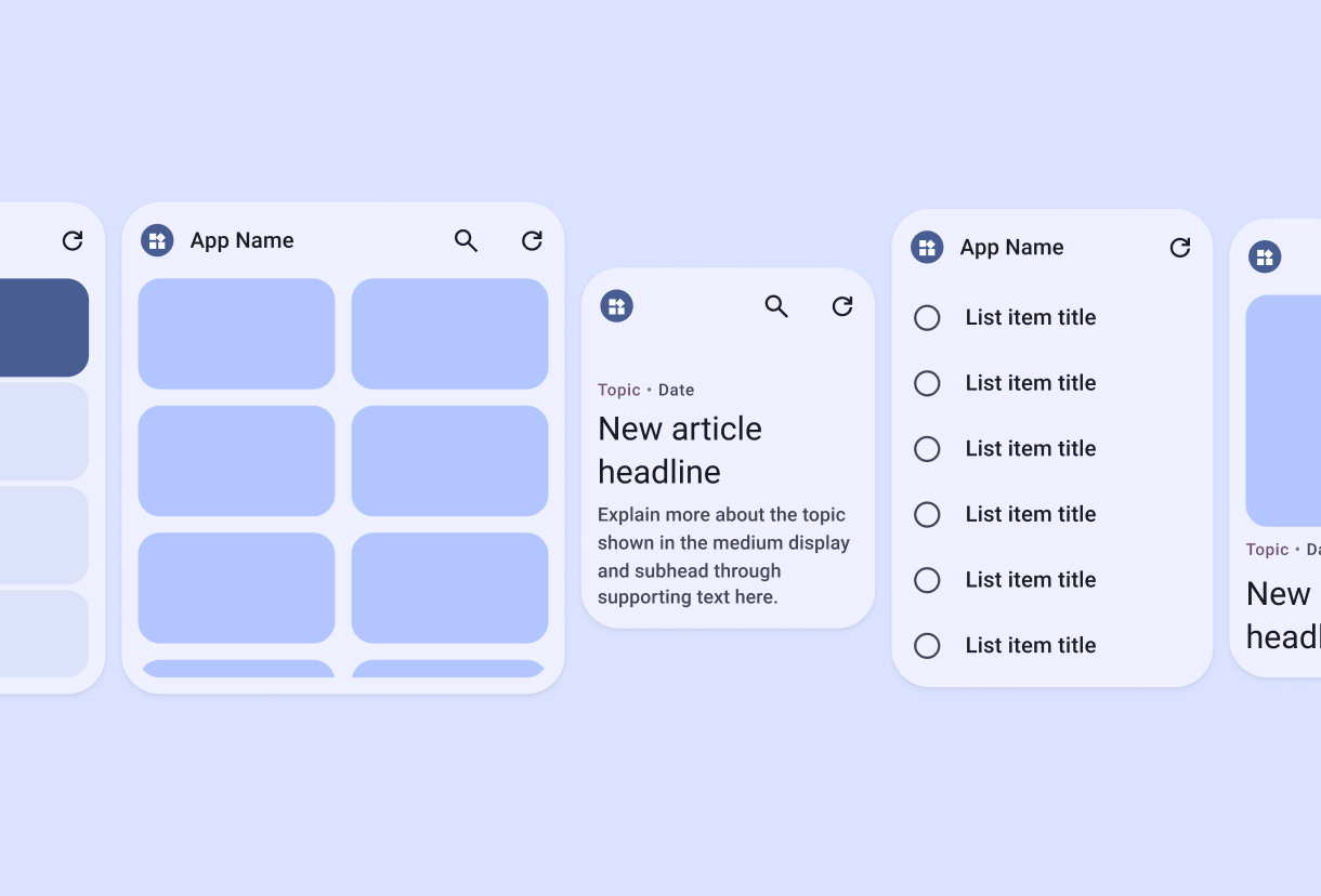 Pelajari lebih lanjut cara mendesain widget yang dapat diskalakan dengan lancar ke berbagai ukuran. Lihat ukuran widget default dan pelajari cara memanfaatkan sepenuhnya ruang petak yang tersedia.