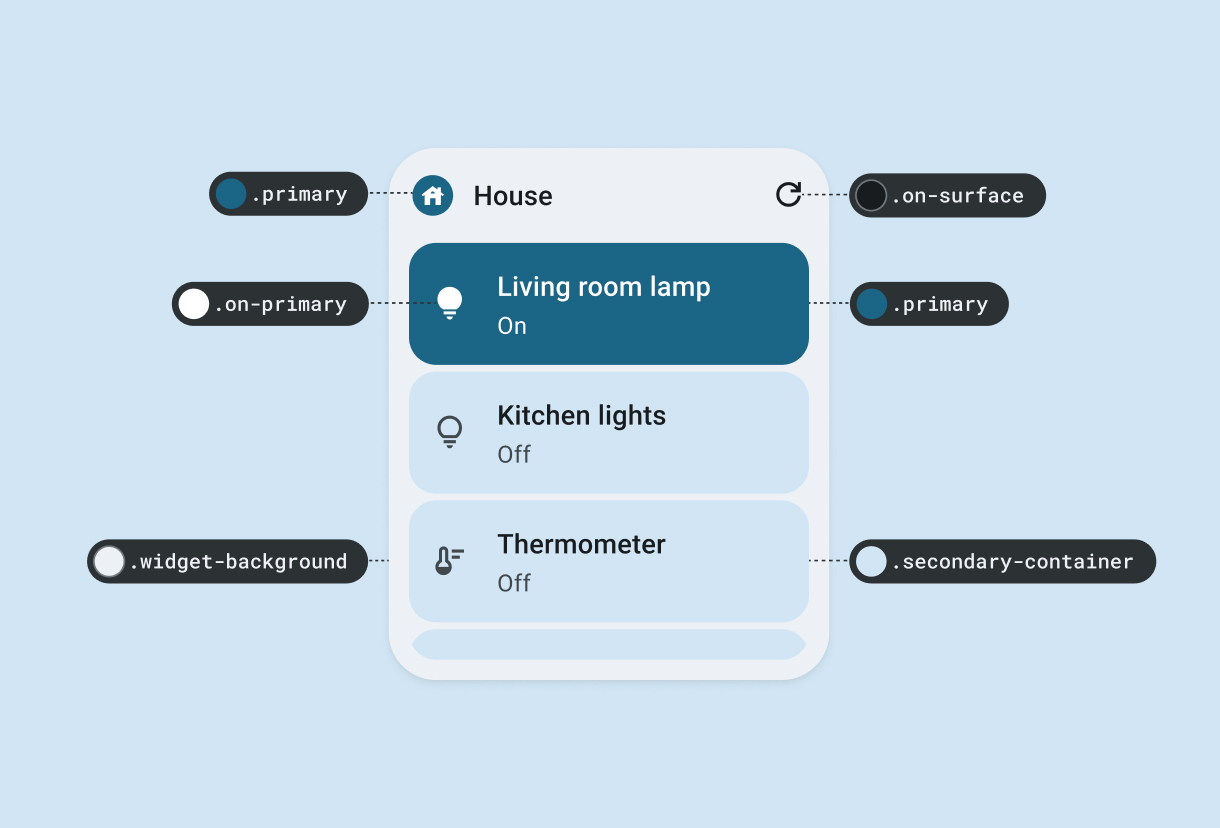Agar lebih sesuai dengan layar utama pengguna, izinkan widget Anda menyesuaikan dengan tema perangkat sistem sehingga widget Anda dapat menggunakan fitur seperti tema terang dan gelap serta setelan kontras.