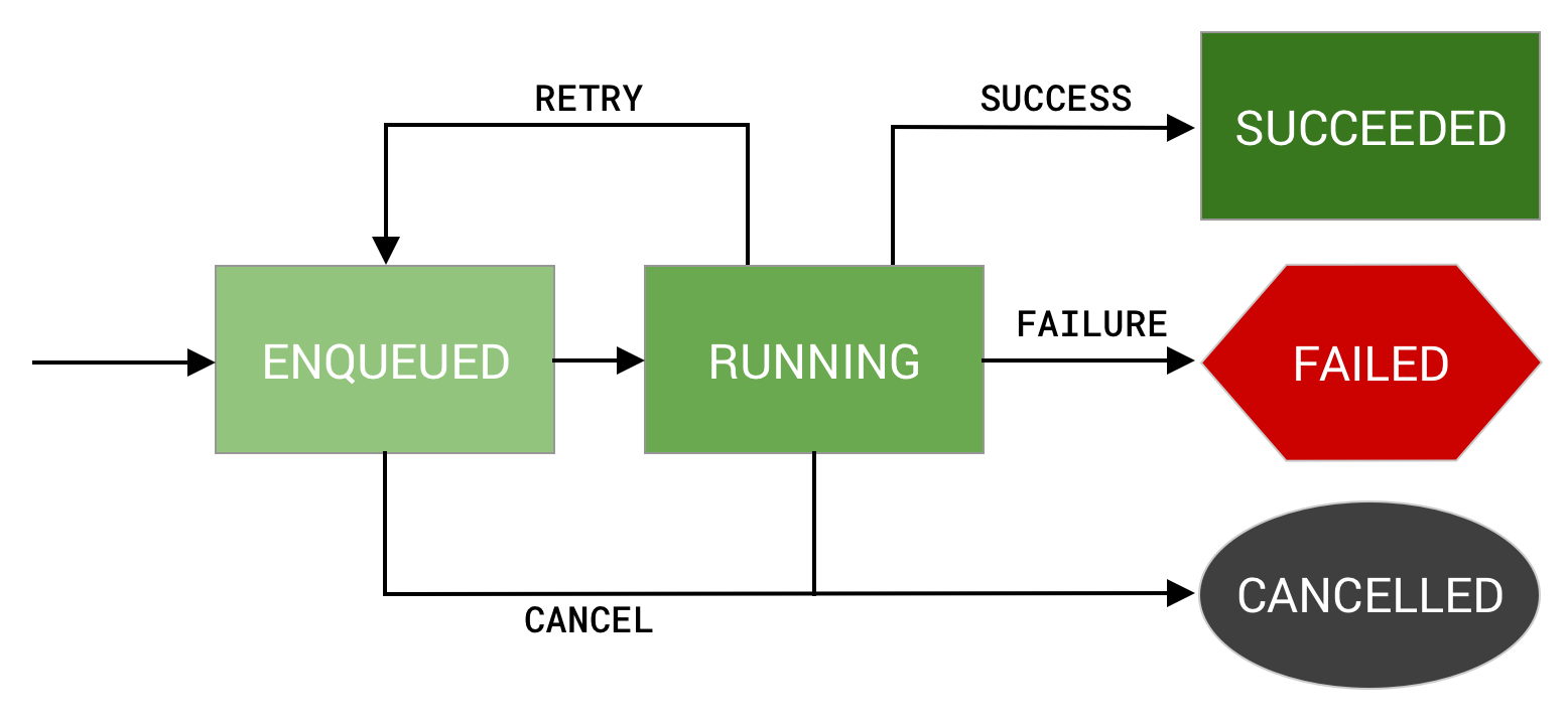 במצב ENQUEUED, העבודה שלכם יכולה לפעול ברגע שמתקיימות הדרישות של Constraints והתזמון של ההשהיה הראשונית. משם היא עוברת למצב RUNNING, ואז, בהתאם לתוצאת העבודה, היא עשויה לעבור למצב SUCCEEDED, FAILED או אולי לחזור למצב ENQUEUED אם התוצאה היא retry. בכל שלב בתהליך אפשר לבטל את העבודה, ואז היא תעבור למצב CANCELLED.