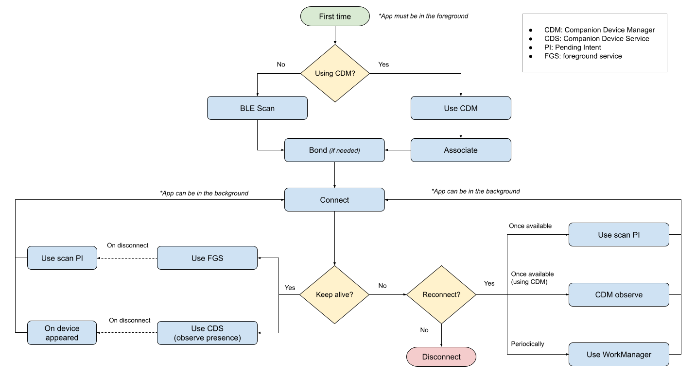 Nie ma żadnych ograniczeń dotyczących łączenia się z urządzeniem, gdy aplikacja działa w tle, ale połączenie zostanie zamknięte, jeśli proces zostanie zatrzymany. Dodatkowo istnieją ograniczenia dotyczące uruchamiania działań (w Androidzie 10 i nowszych wersjach) lub usług na pierwszym planie (w Androidzie 12 i nowszych wersjach) w tle.