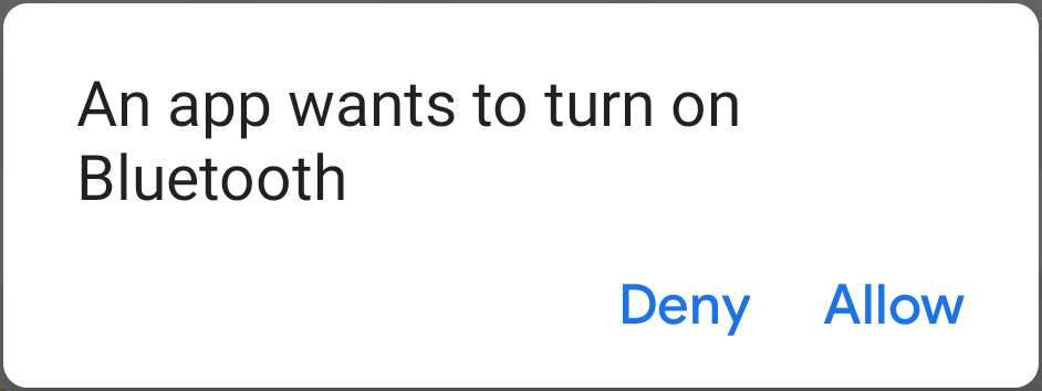 以下に示すように、Bluetooth を有効にするユーザー権限をリクエストするダイアログが表示されます。 図 1.ユーザーが権限を付与すると、システムが Bluetooth の有効化を開始し、 プロセスが完了する(または失敗する)と、フォーカスがアプリに戻ります。