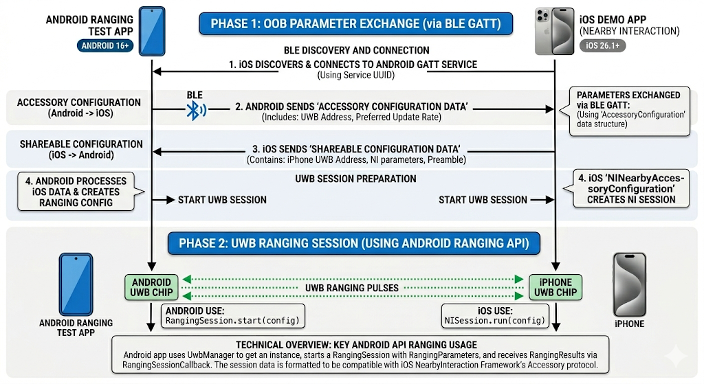 このセッション タイプ(RANGING_SESSION_OOB)では、測距モジュールが OOB ネゴシエーションを処理して測距セッションを開始します。アプリが提供する測距設定に基づいて適切なパラメータを選択し、両方のデバイスがサポートする技術に基づいて適切な技術を使用します。このセッション タイプは、標準化された OOB specification を使用します。
