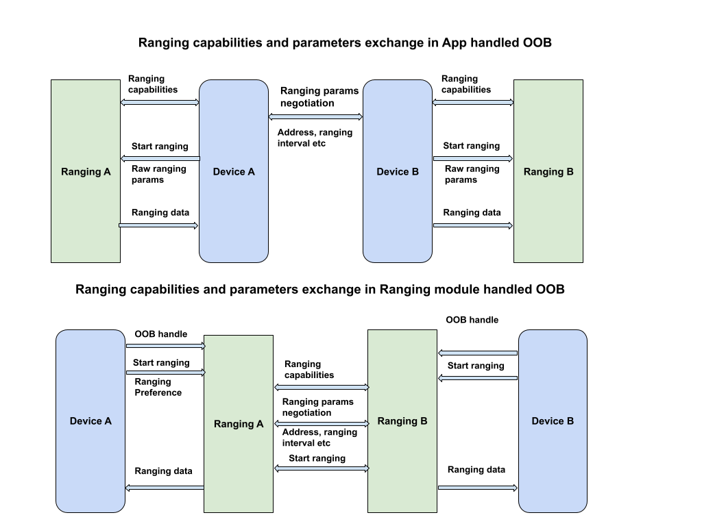 El módulo de Ranging solo define el formato y la secuencia de datos OOB que se usarán para interactuar con un dispositivo par. No controla la detección de dispositivos de pares ni el establecimiento de conexiones.