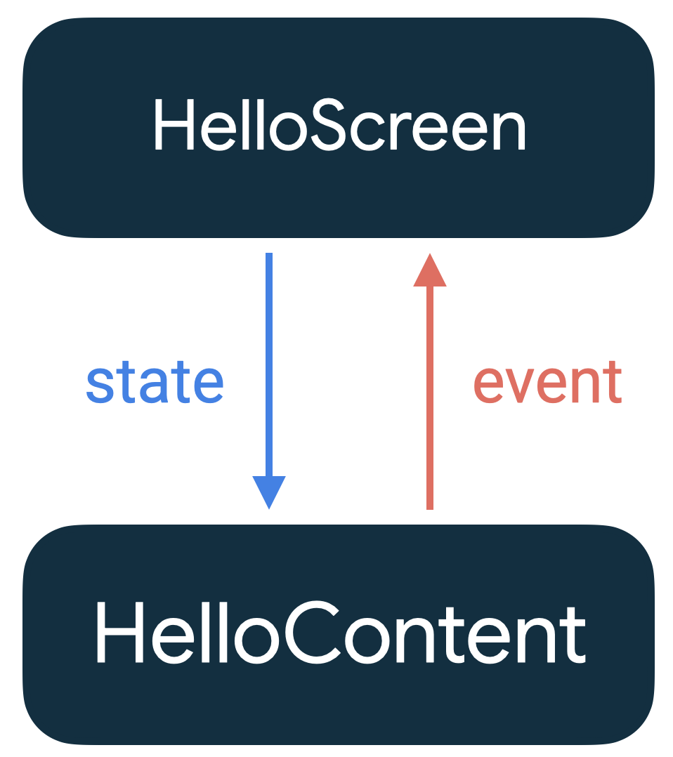 Le modèle où l'état descend et les événements remontent est appelé flux de données unidirectionnel. Dans ce cas, l'état passe de HelloScreen à HelloContent et les événements passent de HelloContent à HelloScreen. En suivant un flux de données unidirectionnel, vous pouvez dissocier les composables qui affichent l'état dans l'interface utilisateur des parties de votre application qui stockent et modifient l'état.