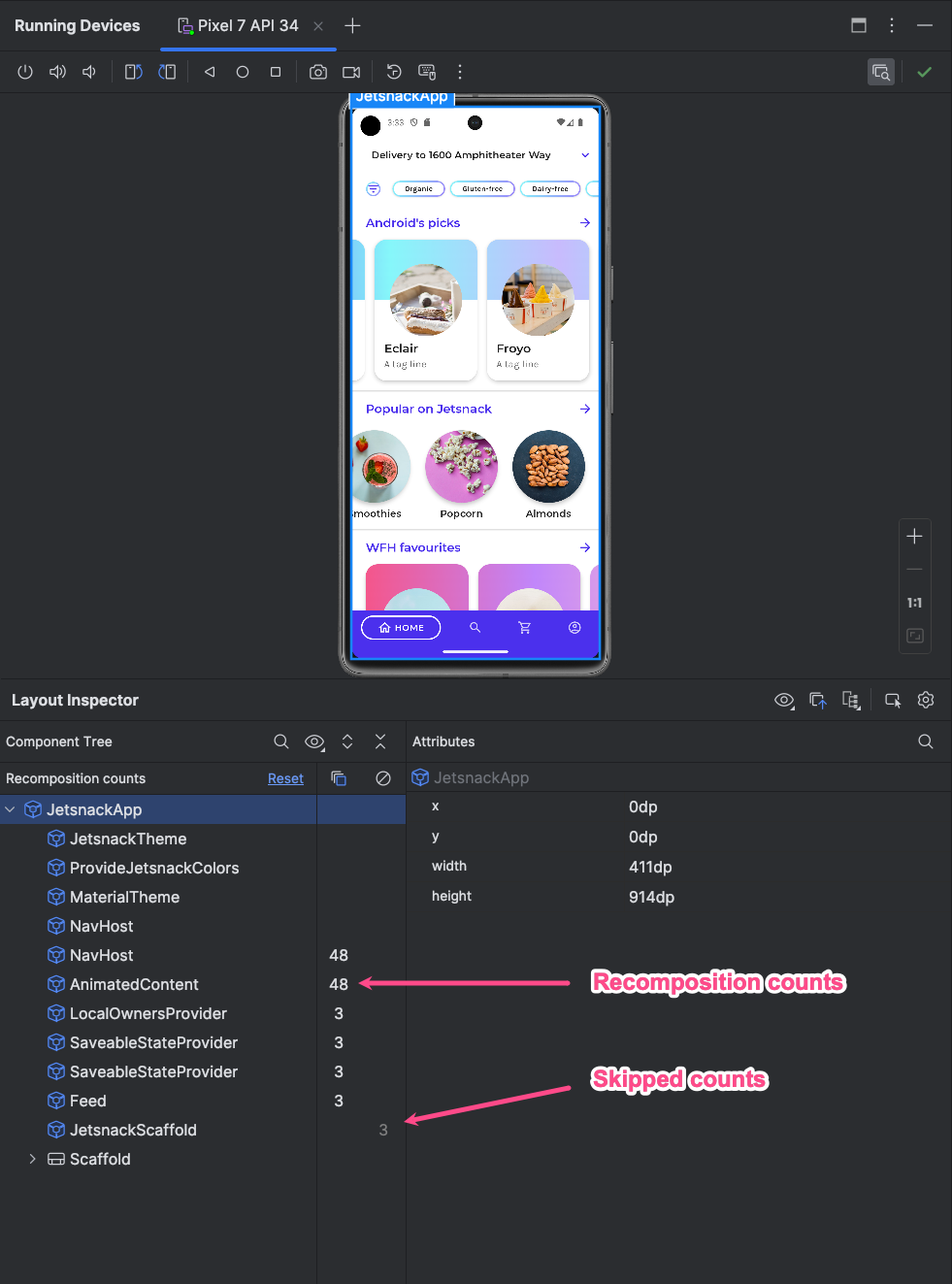 Öffnen Sie das Fenster Layout Inspector und stellen Sie eine Verbindung zu Ihrem App-Prozess her. Im Komponentenbaum gibt es zwei Spalten, die neben der Layouthierarchie angezeigt werden. In der ersten Spalte sehen Sie die Anzahl der Kompositionen für jeden Knoten und in der zweiten Spalte die Anzahl der Überspringungen für jeden Knoten. Wenn Sie einen zusammensetzbaren Knoten auswählen, werden die Dimensionen und Parameter des zusammensetzbaren Elements angezeigt, sofern es sich nicht um eine Inline-Funktion handelt. In diesem Fall können die Parameter nicht angezeigt werden. Ähnliche Informationen finden Sie auch im Bereich Attribute, wenn Sie ein Composable aus der Komponentenstruktur oder der Layoutdarstellung auswählen.