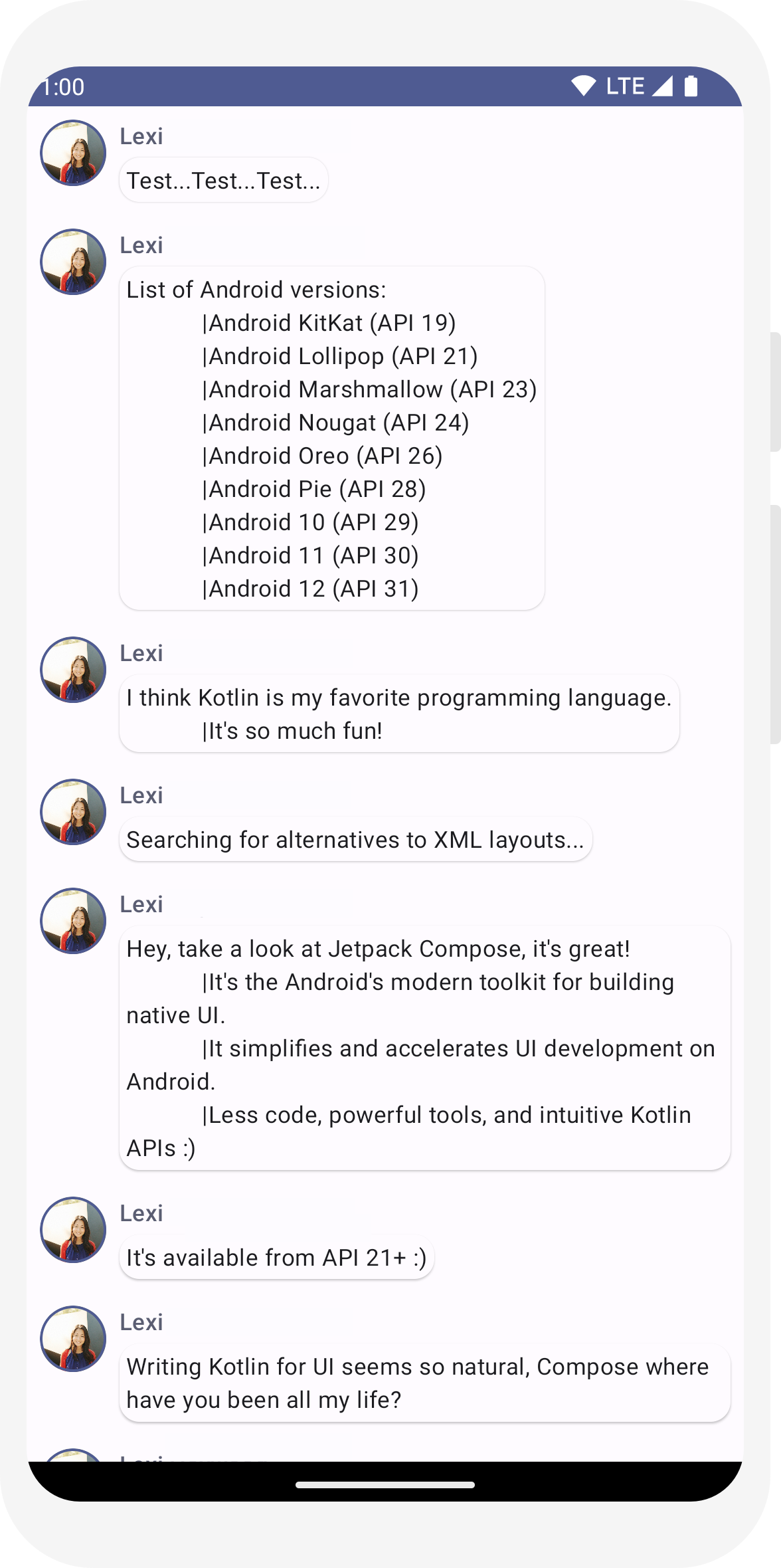// ... import androidx.compose.foundation.lazy.LazyColumn import androidx.compose.foundation.lazy.items @Composable fun Conversation(messages: List<Message>) { LazyColumn { items(messages) { message -> MessageCard(message) } } } @Preview @Composable fun PreviewConversation() { ComposeTutorialTheme { Conversation(SampleData.conversationSample) } }