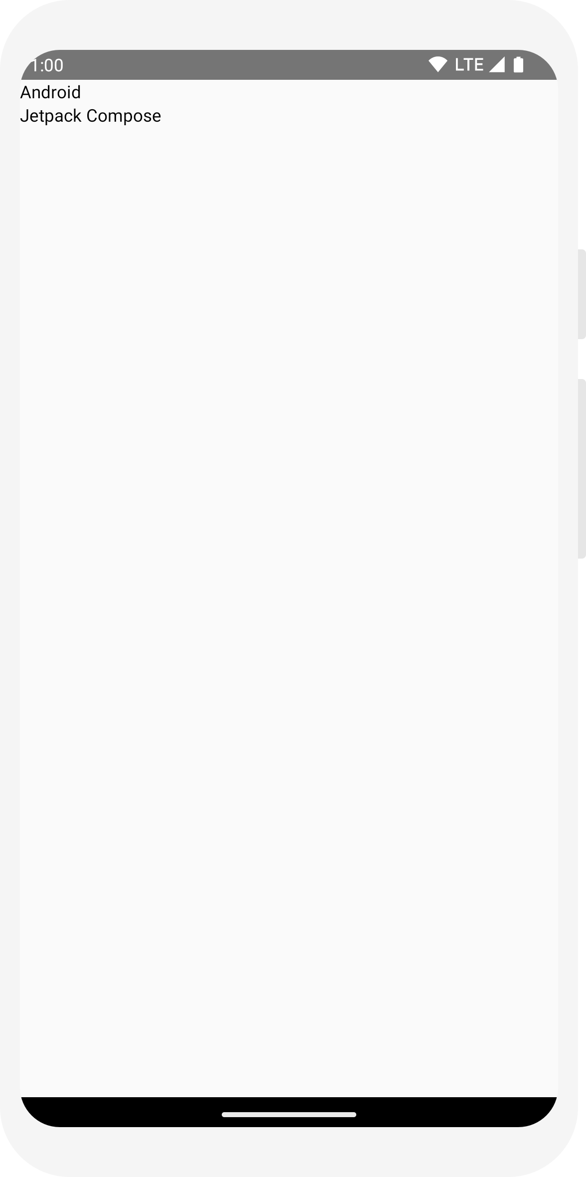 // ... import androidx.compose.runtime.Composable class MainActivity : ComponentActivity() { override fun onCreate(savedInstanceState: Bundle?) { super.onCreate(savedInstanceState) setContent { MessageCard("Android") } } } @Composable fun MessageCard(name: String) { Text(text = "Hello $name!") }