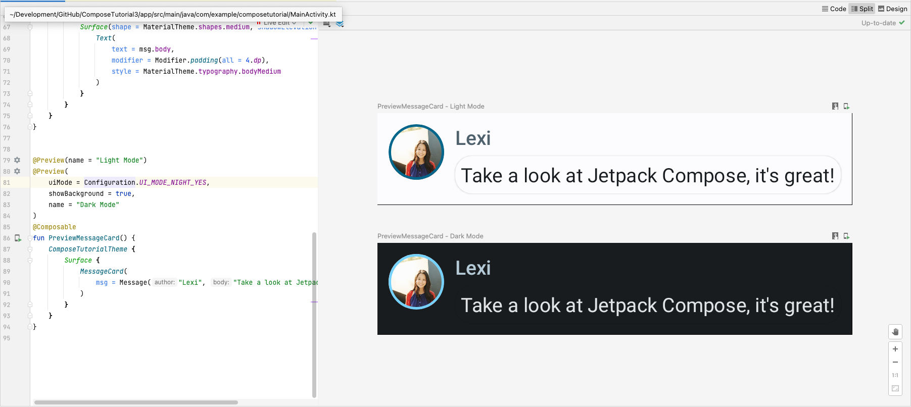 // ... import android.content.res.Configuration @Preview(name = "Light Mode") @Preview( uiMode = Configuration.UI_MODE_NIGHT_YES, showBackground = true, name = "Dark Mode" ) @Composable fun PreviewMessageCard() { ComposeTutorialTheme { Surface { MessageCard( msg = Message("Lexi", "Hey, take a look at Jetpack Compose, it's great!") ) } } }