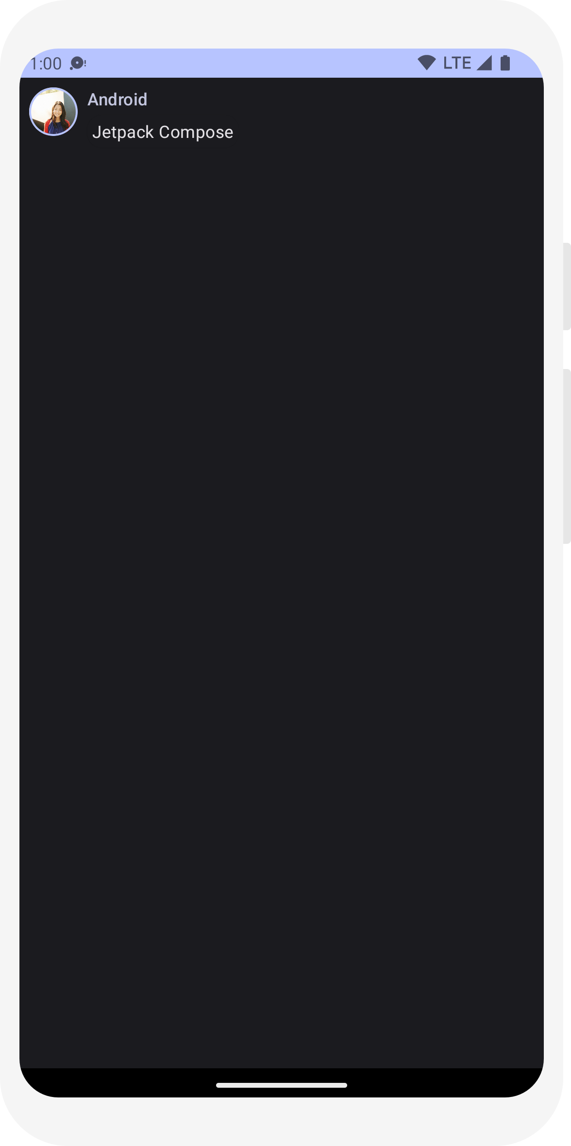 Bạn có thể bật giao diện tối (hay chế độ ban đêm) để tránh hiển thị màn hình sáng (nhất là vào ban đêm) hoặc đơn giản là để tiết kiệm pin của thiết bị. Nhờ sự hỗ trợ từ Material Design, Jetpack Compose có thể xử lý giao diện tối theo mặc định. Việc sử dụng màu, văn bản và nền của Material Design sẽ tự động thích ứng với nền tối.