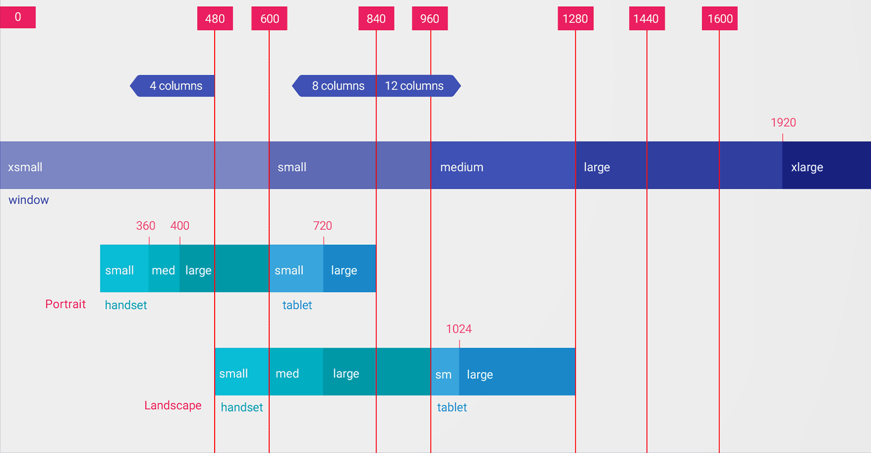 The following figure gives a more detailed view of how different screen dp widths correspond to different screen sizes and orientations.