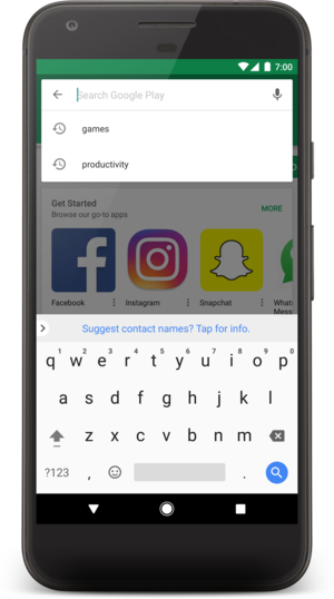 • अगर उपयोगकर्ता कोई सुझाव चुनता है, तो ACTION_SEARCH इंटेंट आपकी खोजे जा सकने वाली गतिविधि को डिलीवर किया जाता है. इसमें सुझाव दिए गए टेक्स्ट को क्वेरी के तौर पर इस्तेमाल किया जाता है.