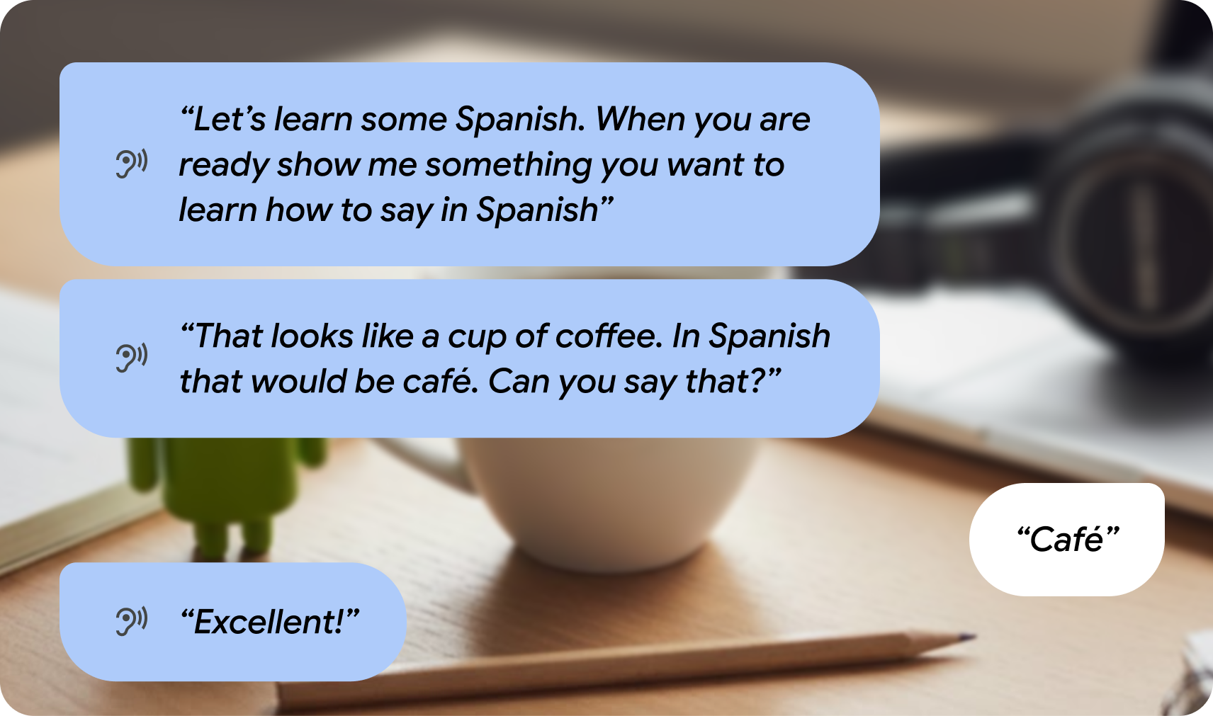 Zintegruj AI i świadomość kontekstową z funkcjami aplikacji na okulary AI. Twórz tryby konwersacyjne za pomocą interfejsu Gemini Live API, które umożliwiają interakcję głosową z modelami Gemini.