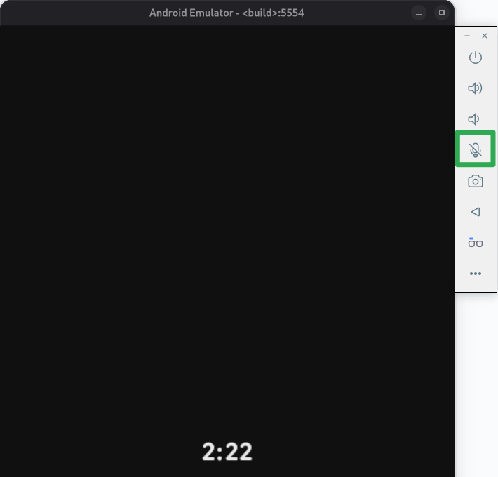 Per attivare/disattivare il microfono, seleziona Microfono dai controlli dell'emulatore. In questo modo, l'input viene connesso e inviato all'emulatore utilizzando il dispositivo di input del microfono predefinito del computer. Questo ha lo stesso effetto dell'utilizzo dell'opzione Il microfono virtuale utilizza l'input audio dell'host nei controlli estesi dell'emulatore.