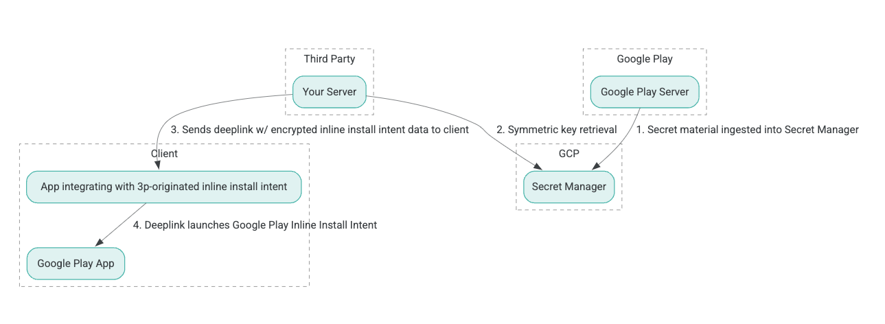 Intent, genera il testo criptato passato nel link diretto utilizzato per richiamare l'intent di installazione incorporata e invia i link diretti al client nelle risposte. - Quando viene seguito il deep link, l'app Google Play gestisce l'intent.