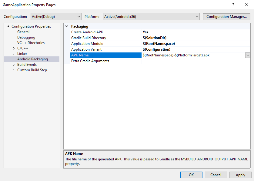 MSBUILD_ANDROID_OUTPUT_APK_NAME: Gradle के ज़रिए बनाए गए APK का अनुमानित नाम. Android Game Development Extension, इस नाम से मैच होने वाला APK खोजेगा और फिर उसे कनेक्ट किए गए डिवाइसों पर डिप्लॉय करेगा. ऐसा, डिबग करने और प्रोफ़ाइल बनाने के लिए किया जाएगा. तीसरे चित्र में दिखाए गए प्रोजेक्ट प्रॉपर्टी पेज पर, APK का नाम बॉक्स में यह वैल्यू सेट करें.
