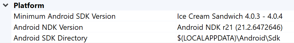 5. تأكَّد من ضبط خصائص حزمة تطوير البرامج (SDK) وNDK لنظام التشغيل Android في المشروع النموذجي على النحو التالي: