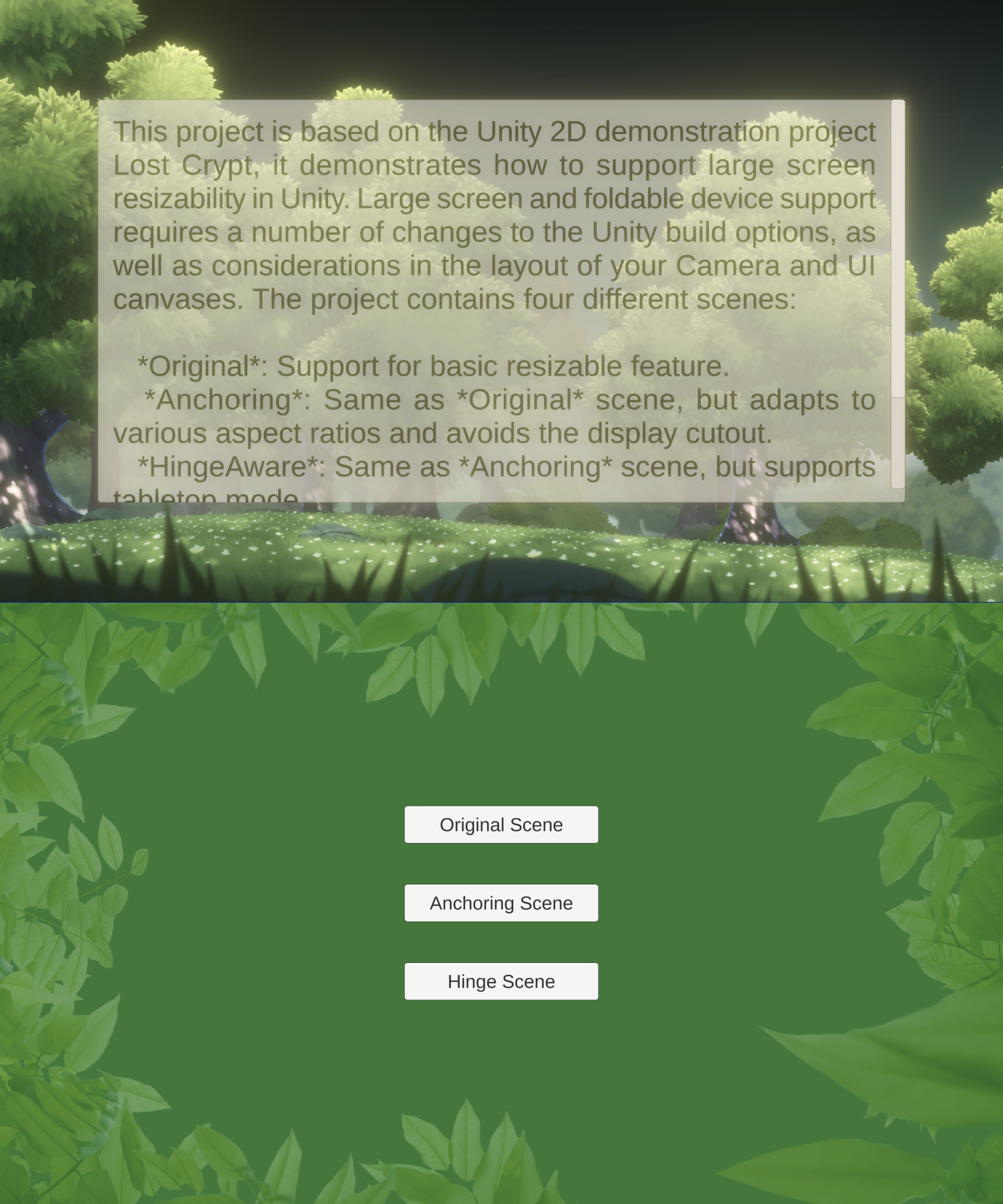 The Unity sample project is based on the Unity 2D demonstration project Lost Crypt. The sample project demonstrates how to support large screen resizability in Unity. Large screen and foldable device support requires a number of changes to the Unity build options, as well as considerations in the layout of your camera and UI canvases.