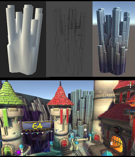 รูปที่ 18 โทโพโลยี ไวร์เฟรม และเวอร์ชันสุดท้ายของหินจาก การสาธิตเทคโนโลยีของ Armies