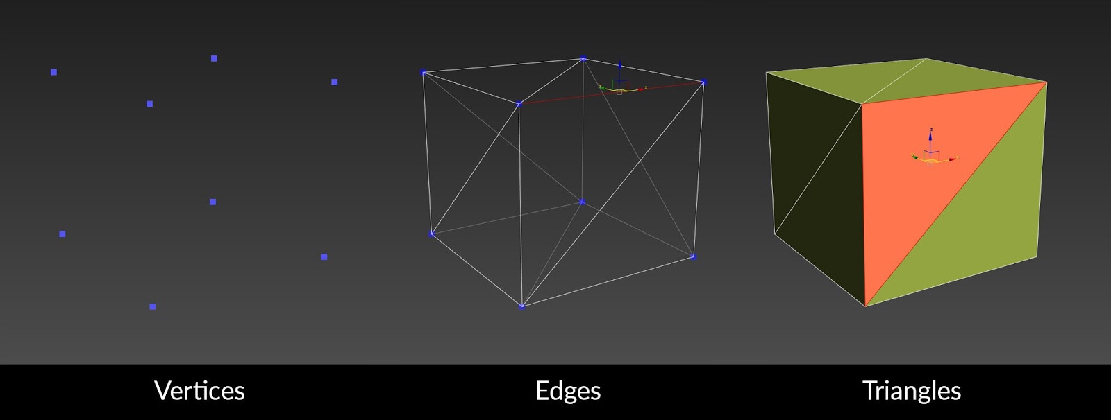 เรขาคณิตหรือตาข่ายรูปหลายเหลี่ยมคือชุดของจุดยอด ขอบ และหน้า ซึ่งประกอบกันเป็นรูปร่างของออบเจ็กต์ 3 มิติ ซึ่งอาจเป็นรถยนต์ อาวุธ สภาพแวดล้อม ตัวละคร หรือชิ้นงานภาพใดก็ได้ในเกม
