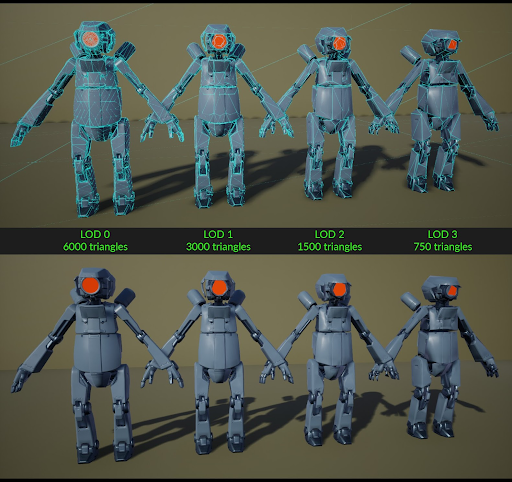 We recommend that you use LOD whenever possible. Focus on the silhouette of the object. It’s best to focus on flat areas to target for vertex reduction. The following image shows use of LOD, applied to the robot model.