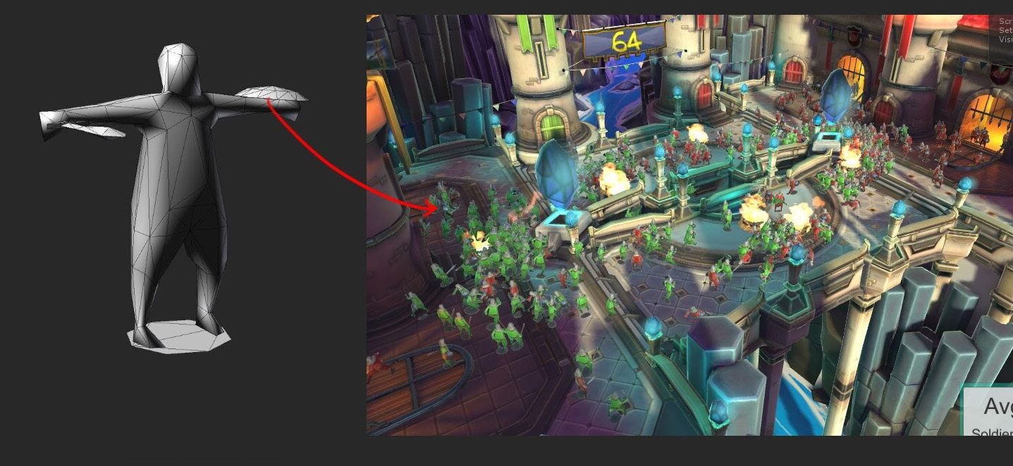 In the Armies demo, which is a 64-bit mobile tech demo built in Unity, the camera is static with many animated characters. In total, each frame renders about 210,000 triangles. This triangle count enables the demo to run stably at approximately 30 frames per second (FPS).