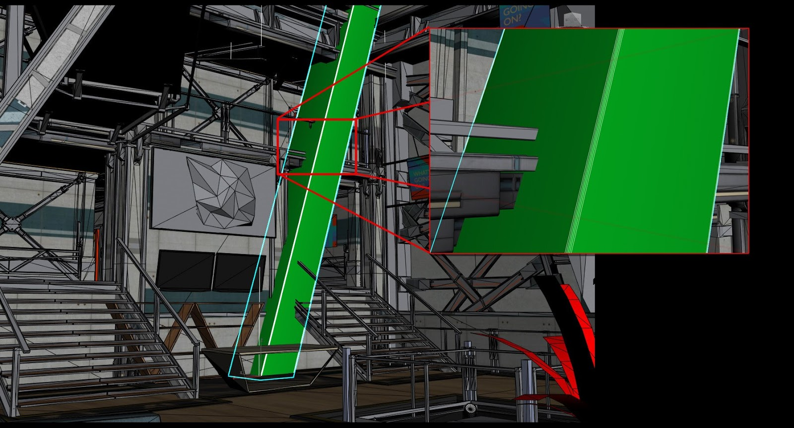 In the following image, the bevel on the pillar has a long, thin triangle when viewed from a distance. These bevels are not a problem if seen close up.
