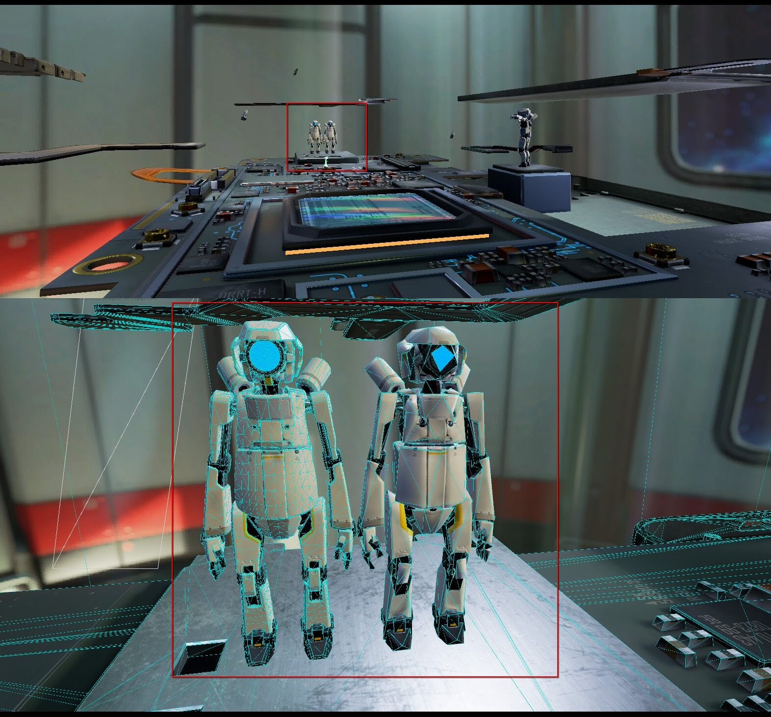 The following example shows two models from different demos. The Circuit VR demo only has one robot character. Because there's only a single object, the robot model has a higher triangle count. The other model is from the Armies demo. This demo has hundreds of soldiers in each frame, so each soldier has fewer triangles.