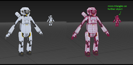 In Figure 9, the foreground robot does not have micro triangles. The background robot does because each triangle is only 1 to 10 pixels in size.