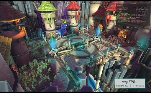 In the Armies demo, which is a 64-bit mobile tech demo built in Unity, the camera is static with many animated characters. In total, each frame renders about 210,000 triangles. This triangle count enables the demo to run stably at approximately 30 frames per second (FPS).