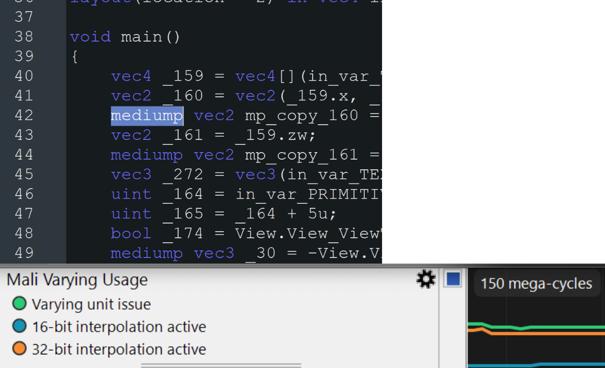 Profiler Penggunaan Bervariasi Mali menampilkan interpolasi 16-bit bersama dengan kode shader menggunakan mediump