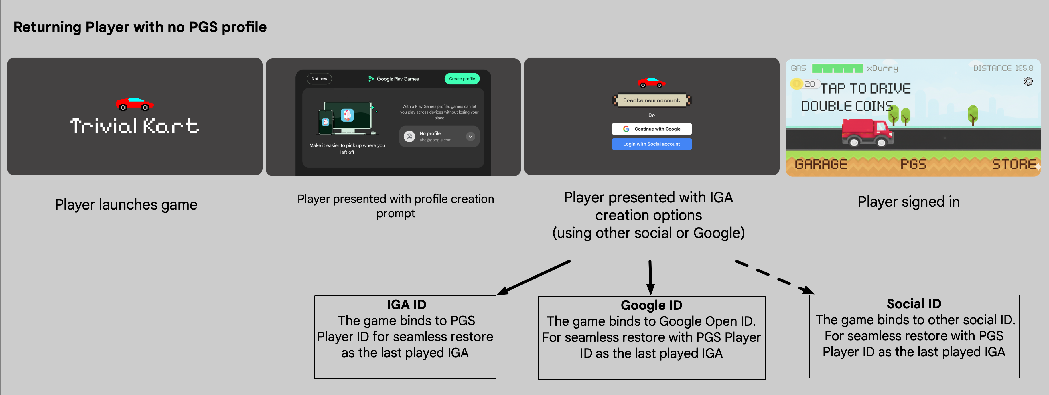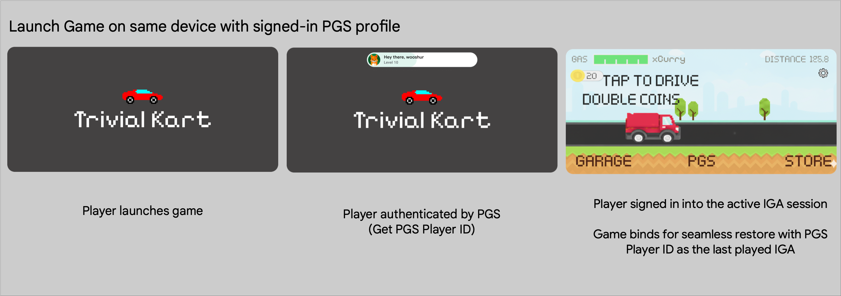 - The game then binds this IGA with PGS player ID as the last played IGA for seamless restore.