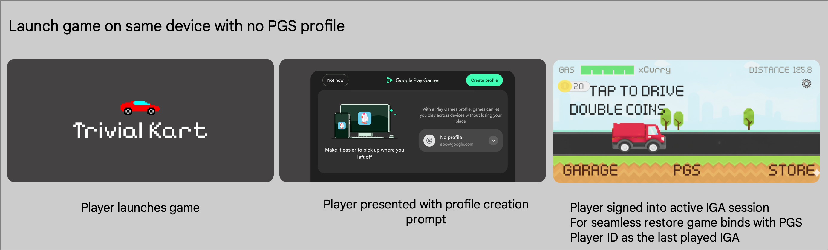 - The game then binds this IGA with PGS player ID as the last played IGA for seamless restore.
