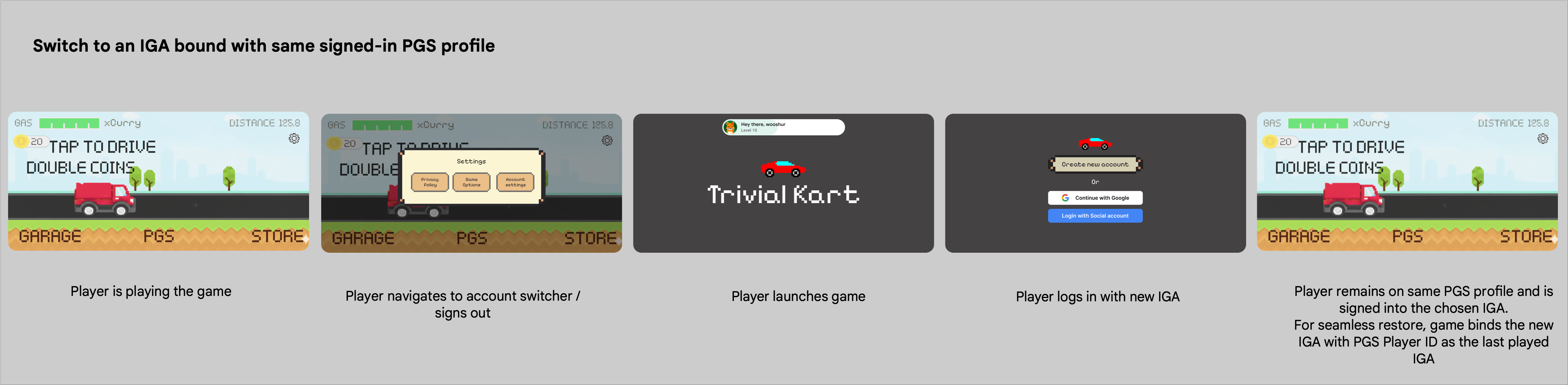 - When the player logs in with a different IGA, the game binds this new account to the current PGS Player ID as the last played IGA only for seamless restore.