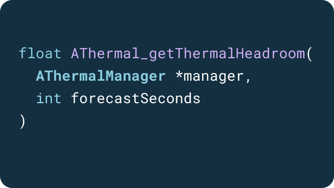 Review a sample app that displays the device's thermal status using the getThermalHeadroom API and the thermal state monitoring API. The app also dynamically changes the workload based on the API's hint, and uses the PerformanceHintManager API to control render thread performance.
