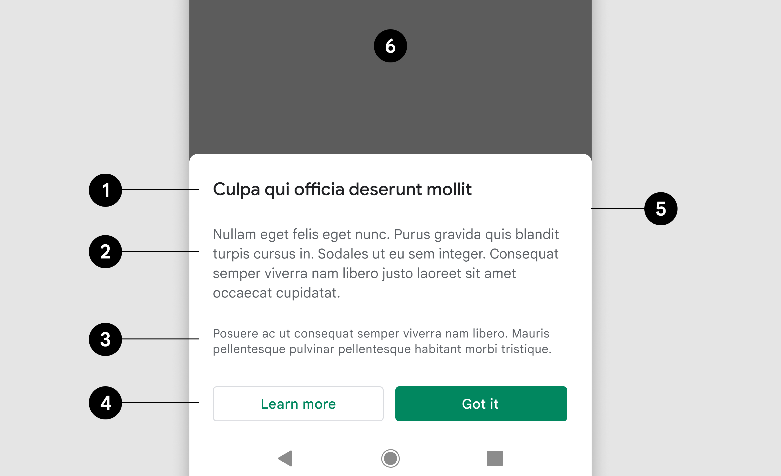 তথ্য পর্দা একটি মডেল নীচের শীট প্রদর্শিত হবে. একটি মডেল নীচের শীট একটি মডেল ডায়ালগের অনুরূপ যা স্ক্রিনের নীচে থেকে অ্যানিমেট হয় এবং নীচে পিন করা থাকে৷ এটি অন্তর্নিহিত স্ক্রিনে সমস্ত UI উপাদানের উপরে উন্নীত হয়। অন্তর্নিহিত স্ক্রিনটি একটি অন্ধকার স্ক্রিমের পিছনে অস্পষ্ট থাকে যাতে বোঝা যায় যে এটি ব্যবহারকারীর মিথস্ক্রিয়ায় সাড়া দেবে না।