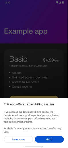 藉由資訊畫面,使用者可瞭解符合資格的應用程式中只提供其他結帳系統。這類結帳系統啟用後,當某位使用者在您的應用程式中開始進行首次交易時,這個畫面就會出現。如果這位使用者之後透過相同裝置在該應用程式中消費,則不會再看到此畫面。請注意,有時在某些情況下 (例如使用者清除裝置上的快取時),系統可能會再次向使用者顯示該對話方塊。