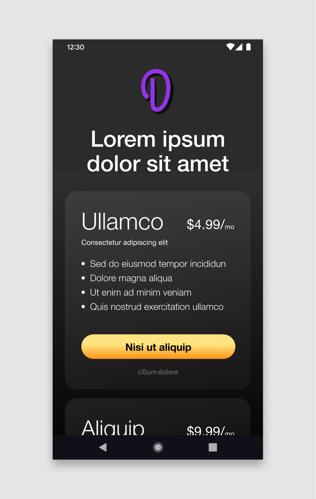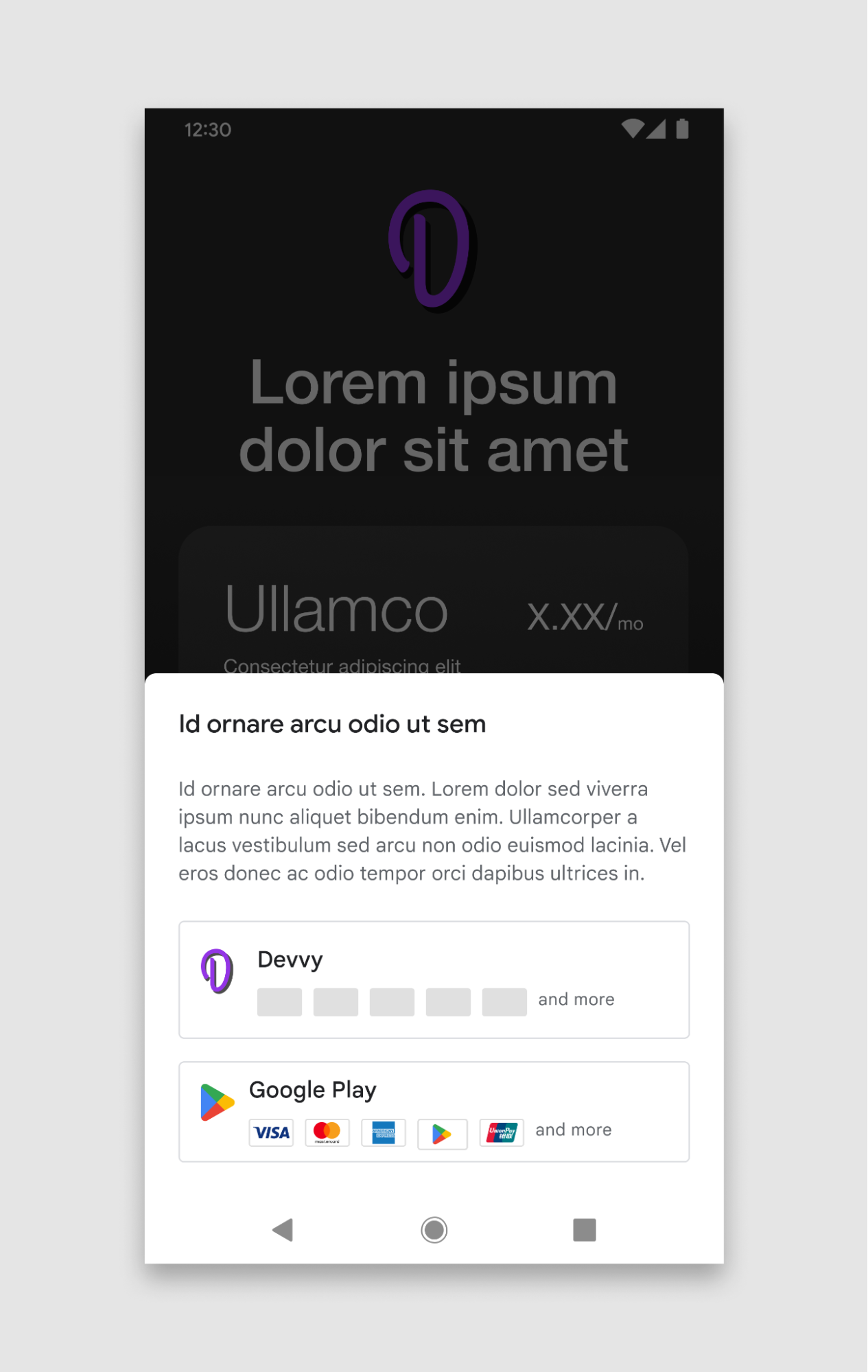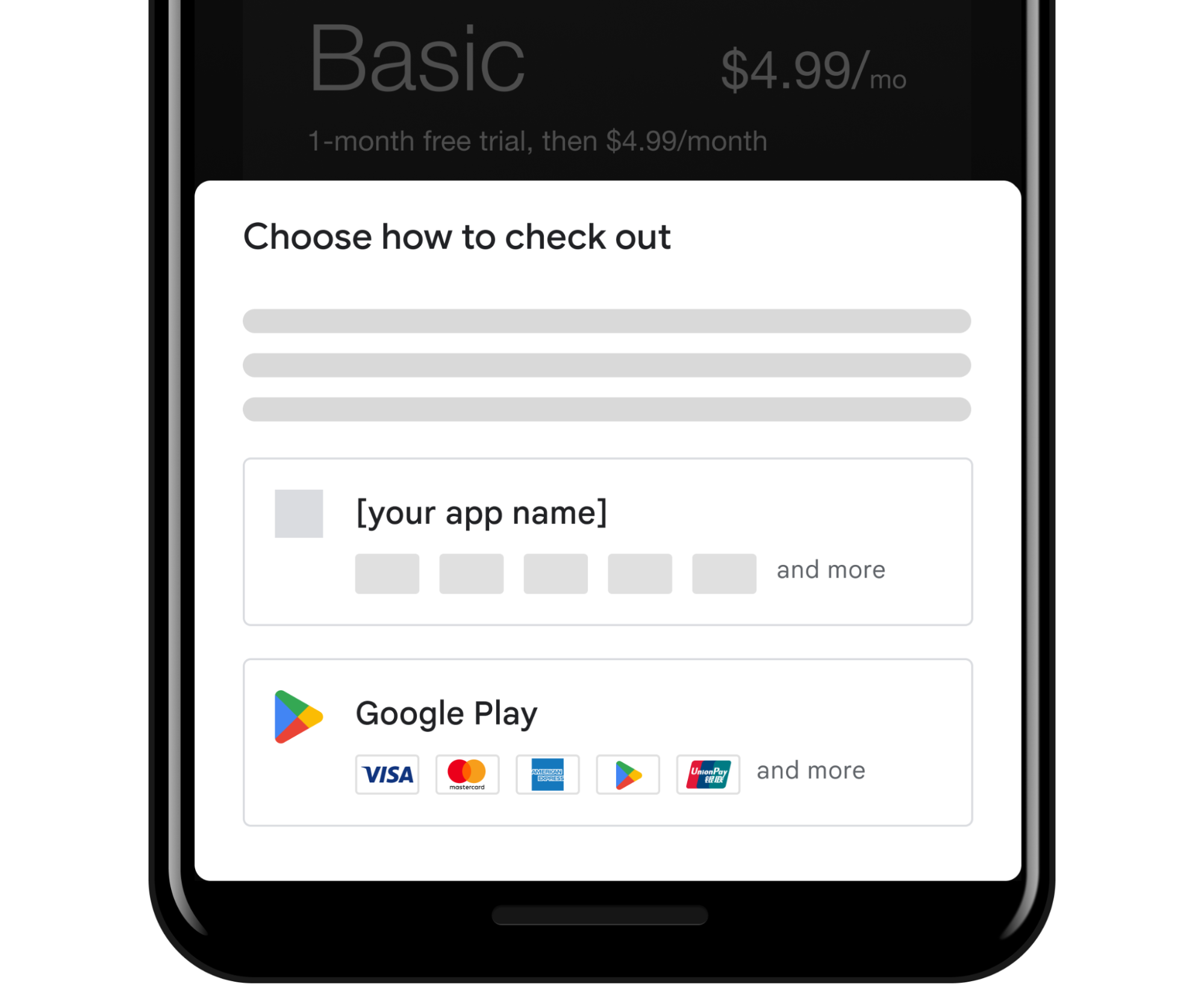 उपयोगकर्ता की पसंद की स्क्रीन पर, लोगों को डेवलपर के अन्य बिलिंग सिस्टम या Google Play के बिलिंग सिस्टम का इस्तेमाल करने का विकल्प मिलता है.