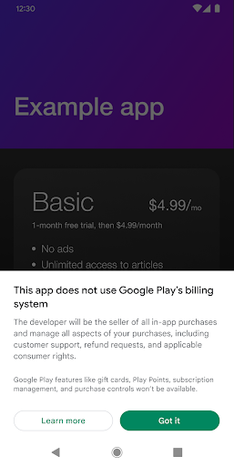 जानकारी वाली स्क्रीन से लोगों को यह समझने में मदद मिलती है कि ज़रूरी शर्तें पूरी करने वाले ऐप्लिकेशन में सिर्फ़ अन्य बिलिंग सिस्टम उपलब्ध कराया जा रहा है. यह स्क्रीन, लोगों को आपके ऐप्लिकेशन में पहली खरीदारी शुरू करने पर दिखेगी. ऐसा तब होगा, जब अन्य बिलिंग सिस्टम चालू कर दिया गया हो. यह मैसेज, एक ही डिवाइस पर आपके ऐप्लिकेशन में एक ही उपयोगकर्ता की ओर से की गई अगली खरीदारी पर नहीं दिखेगा. ध्यान दें कि कुछ मामलों में, उपयोगकर्ता को यह डायलॉग बॉक्स फिर से दिख सकता है. जैसे, अगर उपयोगकर्ता अपने डिवाइस पर कैश मेमोरी मिटाता है.