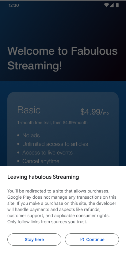 מסך המידע עוזר למשתמשים להבין שהם עומדים לבקר באתר חיצוני. מסך המידע יוצג למשתמשים בכל פעם לפני שהם מופנים אל מחוץ לאפליקציה באמצעות ממשקי ה-API של המבצעים החיצוניים.