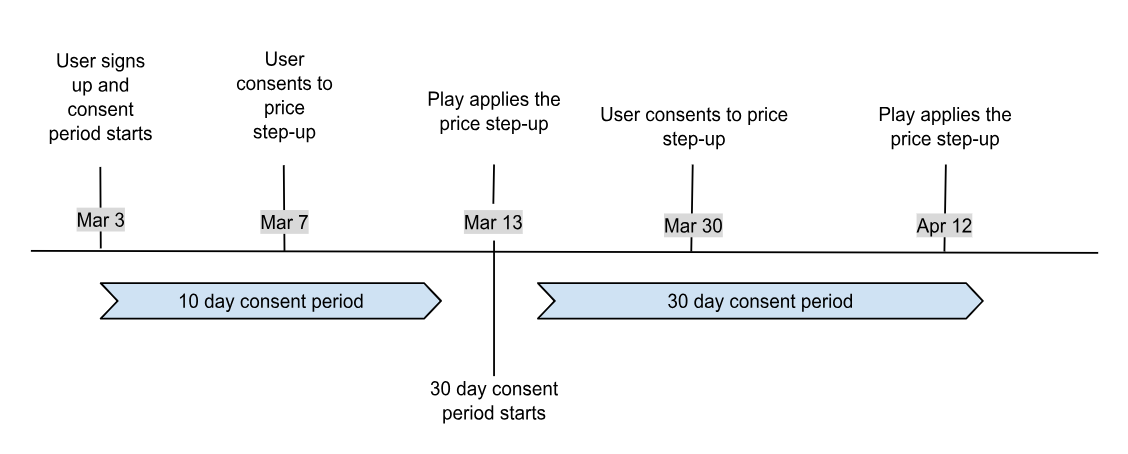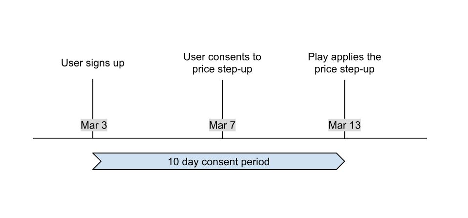 3 月 3 日,韩国境内的用户订阅了某项服务,并获得了 10 天的免费试用期。用户在注册时同意价格逐步上调。在这种情况下,Play 会在 3 月 13 日应用价格上调。