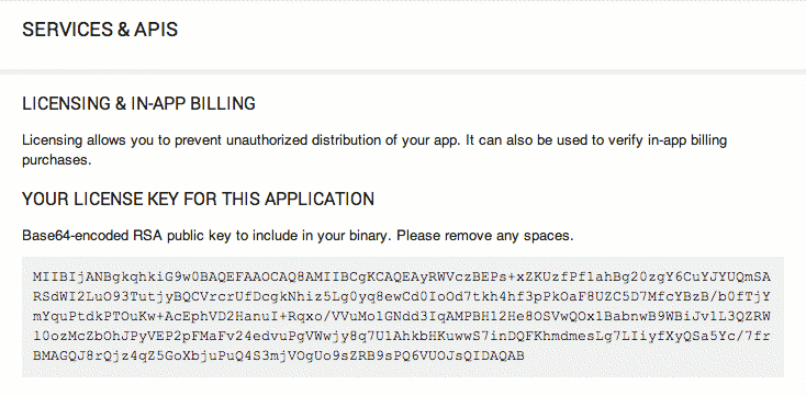 - Obtain the app's public key for licensing. When you are implementing licensing in an application, you must copy the public key string into the application. You can obtain the app's public key for licensing in the Services & APIs page (under All Applications).